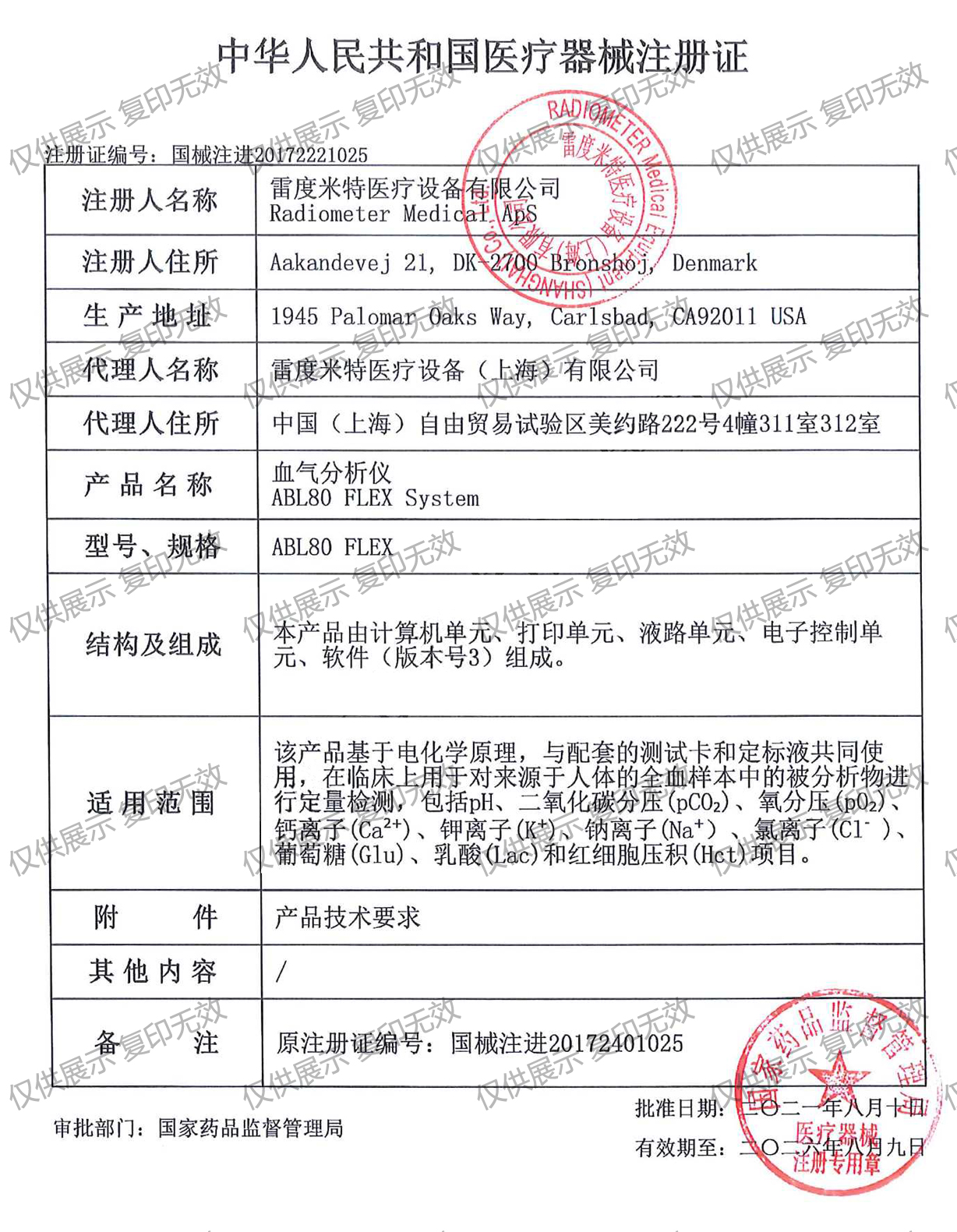 適用范圍:該產(chǎn)品基于電化學原理,與配套的測試卡和定標液共同使用,在臨床上用于對來源于人體的全血樣本中的被分析物進行定量檢測,包括pH、二氧化碳分壓(pCO2)、氧分壓(pO2)、鈣離子(Ca2+)、鉀離子(K+)、鈉離子(Na+)、氯離子(Cl- )、葡萄糖(Glu)、乳酸(Lac)和紅細胞壓積(Hct)項目。