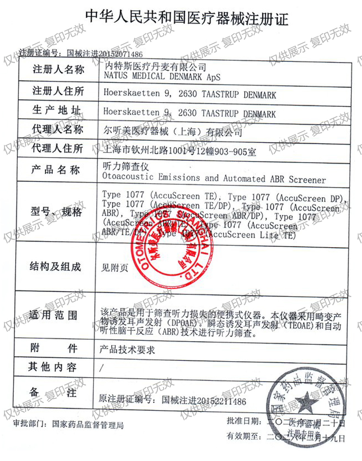 適用范圍:該產品是用于篩查聽力損失的便攜式儀器。本儀器采用畸變產物誘發(fā)耳聲發(fā)射(DPOAE)。瞬態(tài)誘發(fā)耳聲發(fā)射(TEOAE)和自動聽性腦干反應(ABR)技術進行聽力篩查。